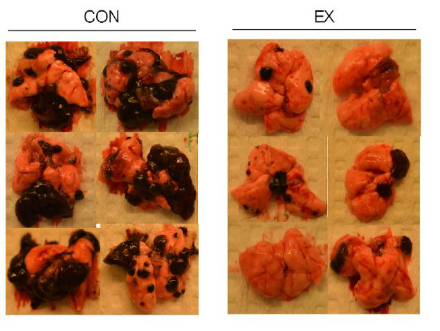 图2黑色素瘤肺转移模型。左边是不运动的对照组的肺,右边是坚持在仓鼠球中跑步的小鼠的肺,对照组小鼠肺部肿瘤无论是体积还是数量都远大于右侧坚持运动的小鼠的肺。