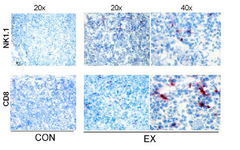 图3。肿瘤组织染色切片,左图为不运动的对照组,右图为运动组,红色染色细胞为NK细胞。在对照组中,NK细胞出现频率过低,几乎不可见。在运动组中,NK细胞明显增多。