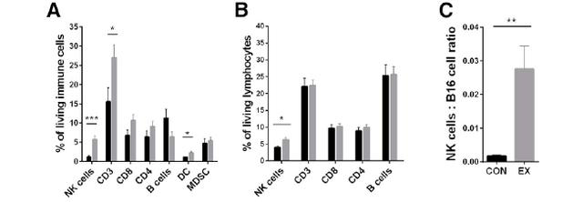 没错,研究人员观察到,在没有任何肿瘤的小鼠身上,如果它也和实验组一样坚持运动,那么在骨髓、脾脏、外周血中,NK细胞的出现频率会增高。