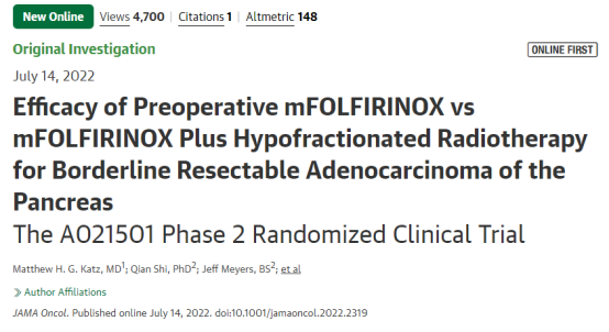 [4]Efficacy of Preoperative mFOLFIRINOX vs mFOLFIRINOX Plus Hypofractionated Radiotherapy for Borderline Resectable Adenocarcinoma of the Pancreas: The A021501 Phase 2 Randomized Clinical Trial | Gastroenterology | JAMA Oncology | JAMA Network